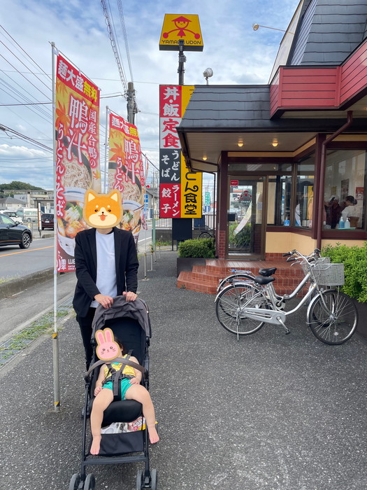 祝日秋分の日のお昼13時という最も混み合いそうな時間帯に訪問。恒例の記念撮影。子供はちょうど寝てくれていました。