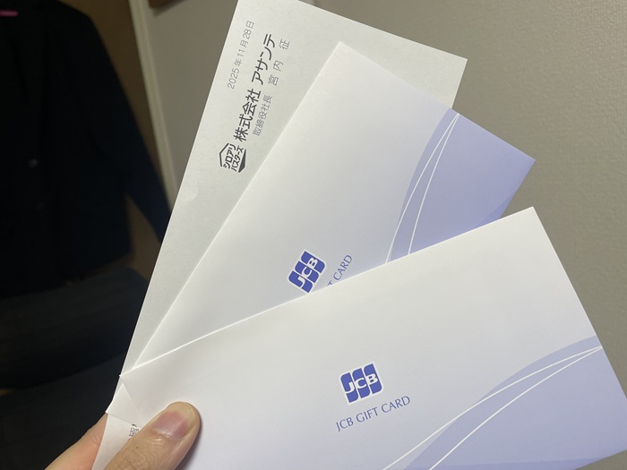 ホーム未分類 【株主優待】アサンテからギフトカードが届きました(5回目) 2025年12月13日 「アサンテ」からギフトカード(1000円分×2)が届きました。 嫁の分も購入しているので2000円分です。ジュニアNISAが再開されたら子供の名義でも購入したいです。