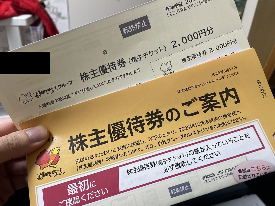 ホーム株・投資・税金 【株主優待】すかいらーくから優待カードが届きました(17回目) 2026年3月19日 「すかいらーく」から2000円分の優待カードが届きました。 今回から電子チケットへ変更になったようです。